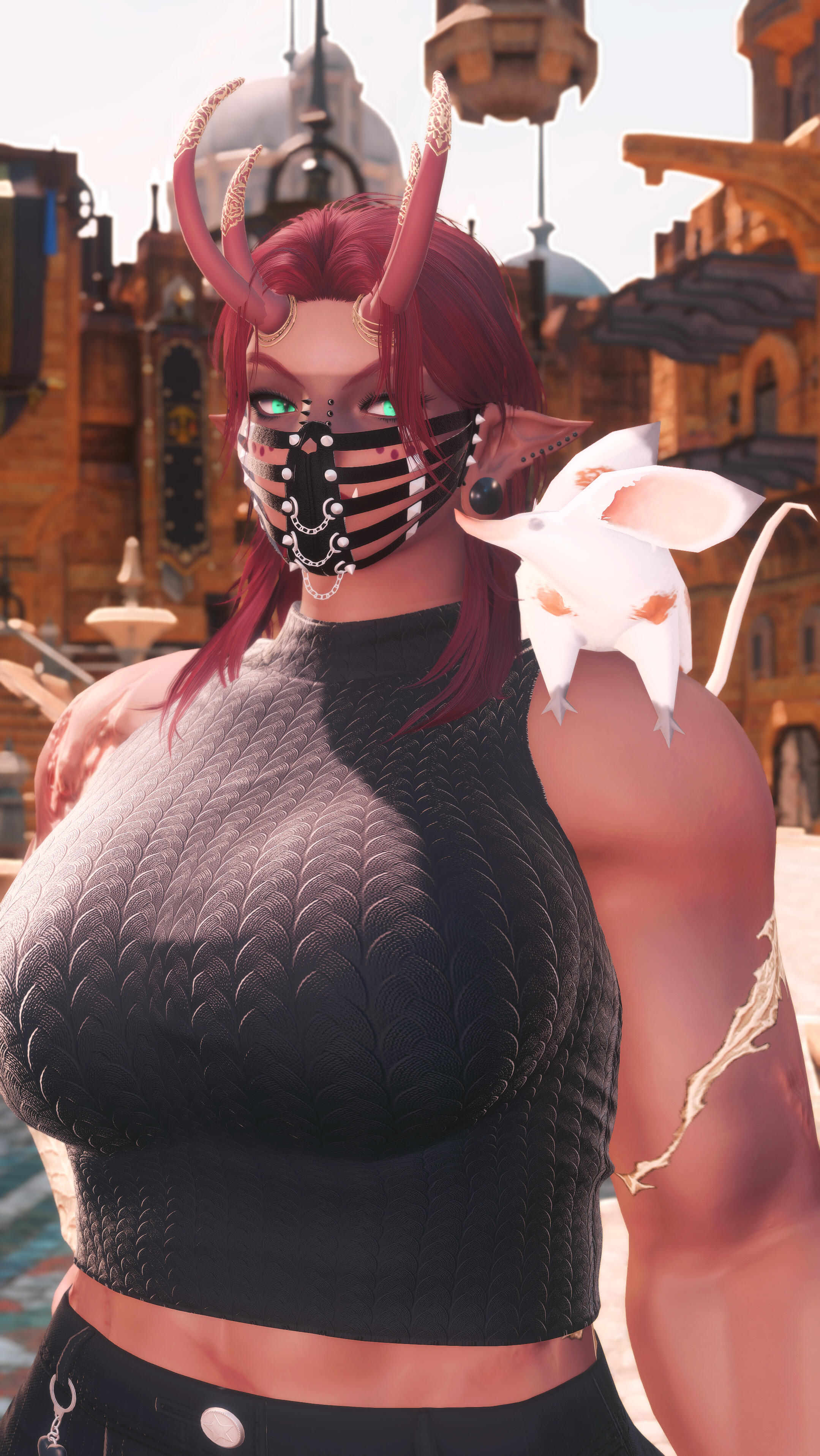 Raised in the Bloodsands from a young age, Scarlet is a known name from Ul'dahs resident Coliseum. The 'Scarlet Devil', often leaving her opponents with violent gash wounds from her outward pointing teeth, or burns from her fire-aspected aether, any with a recollection of the place from the past would know her for that violent past.